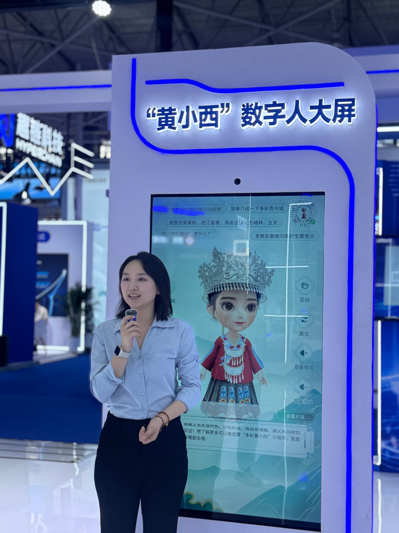 数博会期间,“黄小西”数字人交互大屏在主会场持续展出,整合语音识别、多模态交互和智能推荐等技术,为观众提供沉浸式、拟人化的旅游咨询服务,吸引大量观众互动体验,成为“AI+旅游”创新应用的现场焦点。